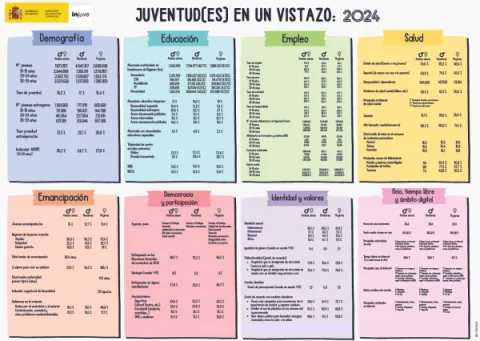 Juventud(es) en un vistazo: 2024 ofrece un resumen de la situación de las personas jóvenes en España en 2024. A modo de infografía, se obtienen los principales datos relativos a demografía, educación, empleo, salud, emancipación, democracia, valores y ocio de las juventudes en España. Además de ofrecer la información principal al respecto, se ofrecen las referencias bibliográficas para poder ampliar la información.